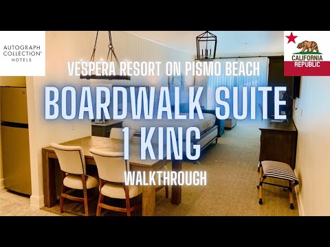 This is a walkthrough of a Boardwalk Suite (1 King, Sofa Bed, Ocean View) at Vespera Resort on Pismo Beach in California.